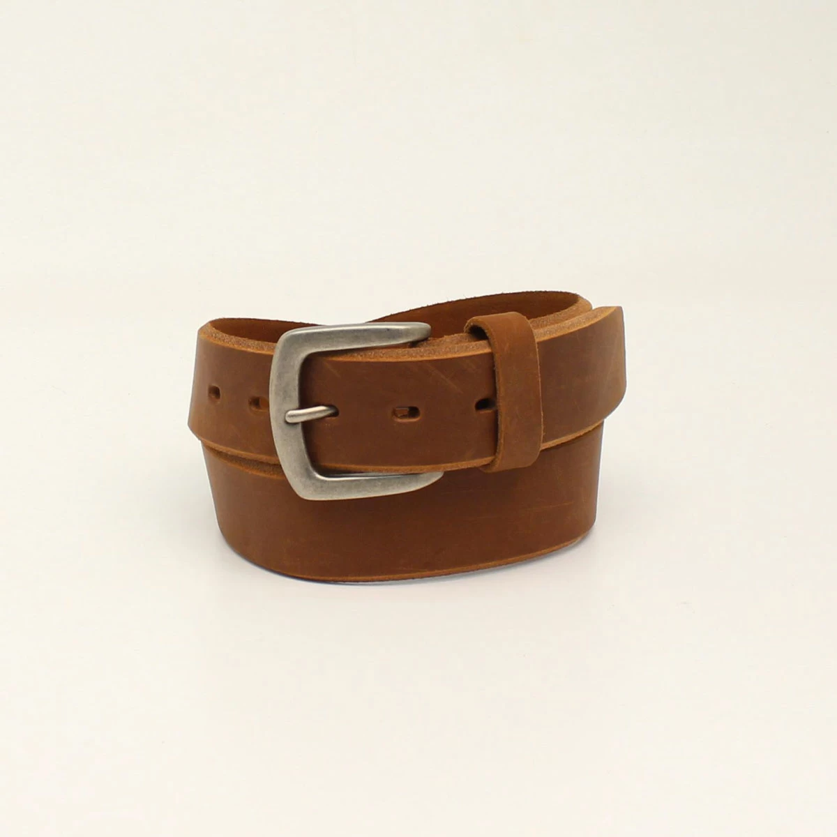 This simple Ariat men’s belt by M&F Western Products features a medium brown strap with a beveled edge and an embossed Ariat logo. Removable buckle.