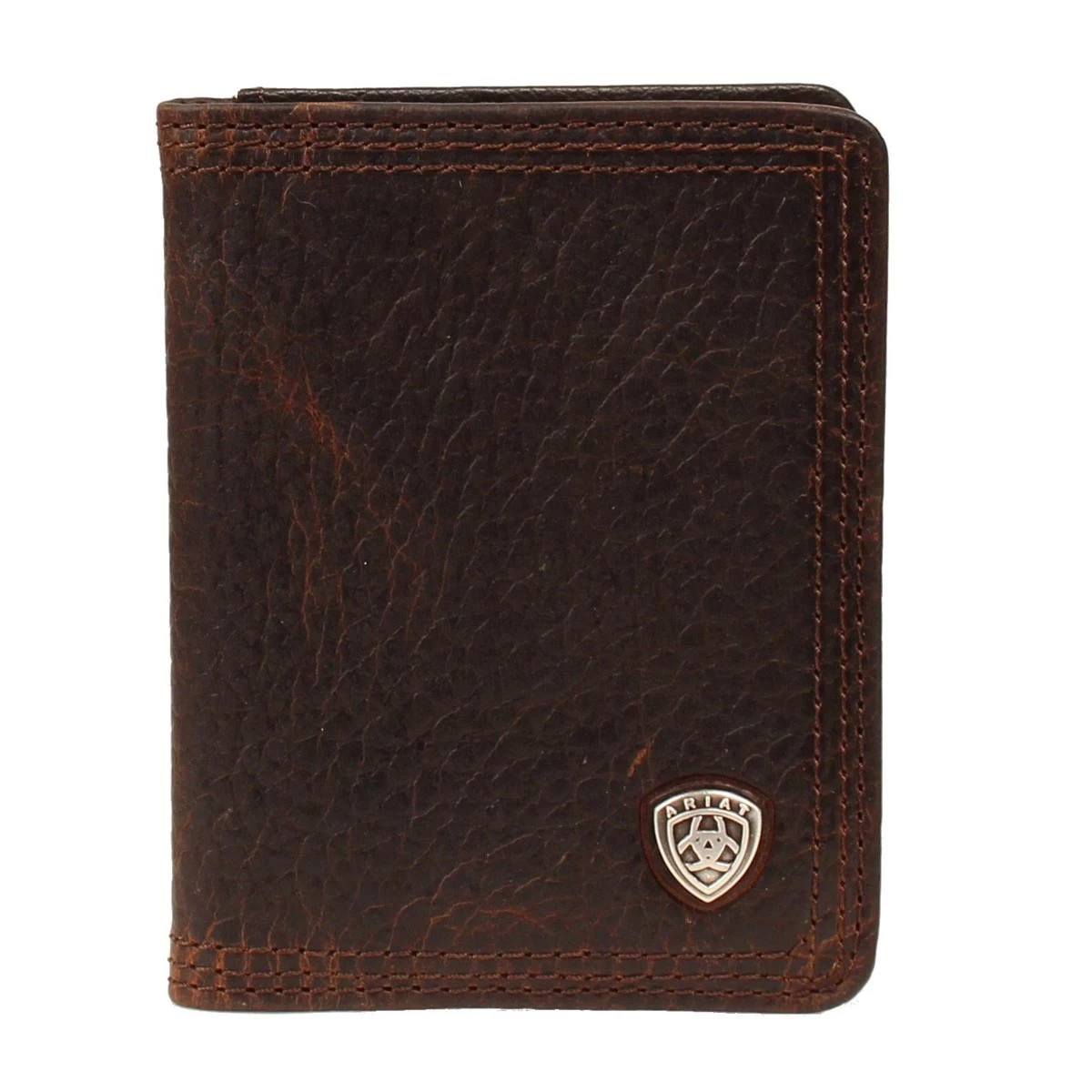 This Ariat Bifold Money Clip Wallet by M&F Western Products features an oil tan dark copper leather and Ariat brand concho. Inside features a clear ID slot, credit card slots, and money slots.