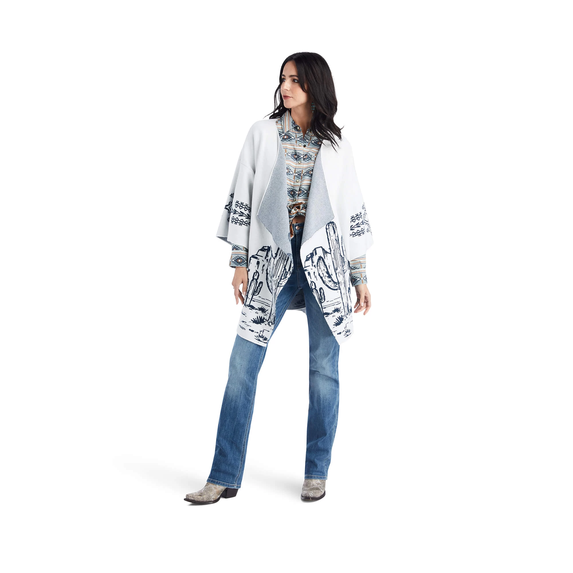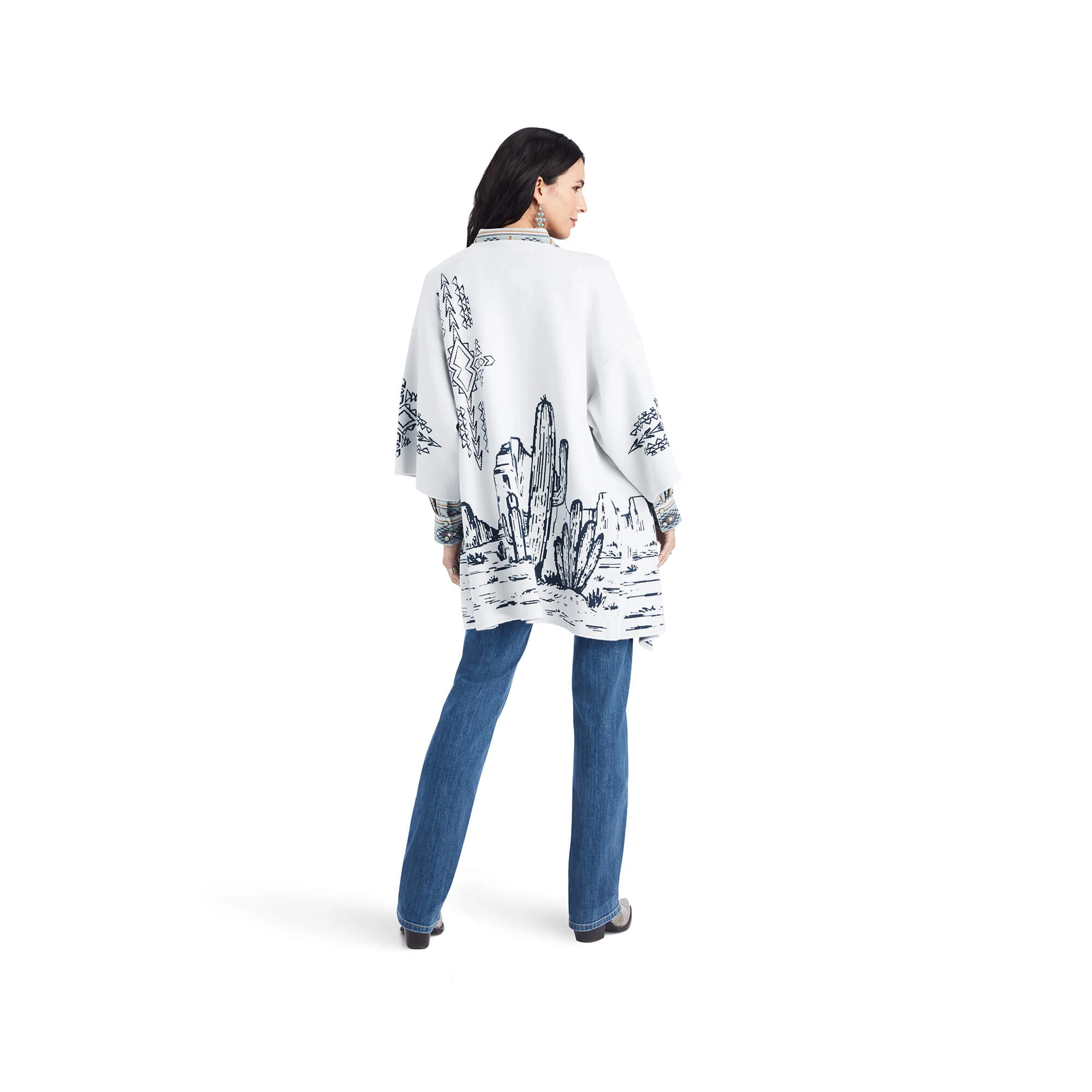 Effortless and elegant, this incredibly soft cardigan is perfect for layering on over a dressy top or casual tee. The beautiful, knit-in desert scene adds southwestern flair.
