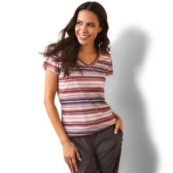 Outdoor active? Meet your perfect shirt. Our V-neck top has features to keep you cool and comfortable, including moisture-wicking abilities and sun protection.